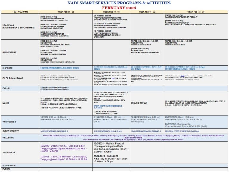 Assalamualaikum adik-adik, berikut dilampirkan jadual tuisyen di NADI Felda Tersang 2 sepanjang bulan Febuari 2026. Jika adik-adik berminat boleh datang ke NADI untuk sebarang pertanyaan dan semua kelas adalah percuma.