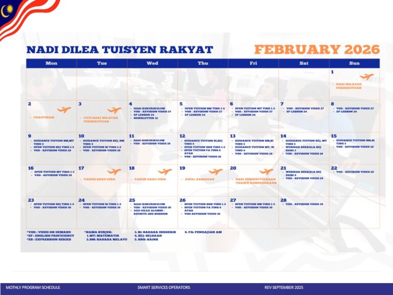 Assalamualaikum adik-adik, berikut dilampirkan jadual tuisyen di NADI Felda Tersang 2 sepanjang bulan Febuari 2026. Jika adik-adik berminat boleh datang ke NADI untuk sebarang pertanyaan dan semua kelas adalah percuma.