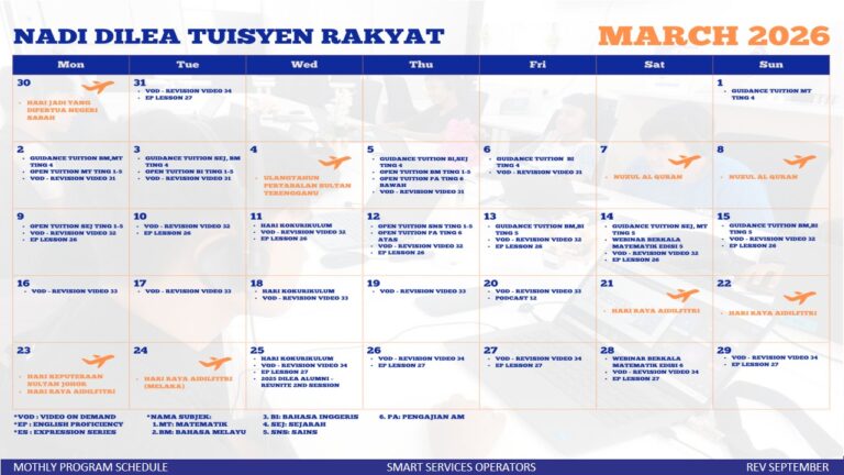 Assalamualaikum berikut dilampirkan jadual tuisyen yang berlansung di NADI Felda Tersang 2 sepanjang bulan 3/2026 secara percuma, sapa-sapa yang berminat boleh datang ke NADI untuk pendaftaran dan maklumat lanjut.