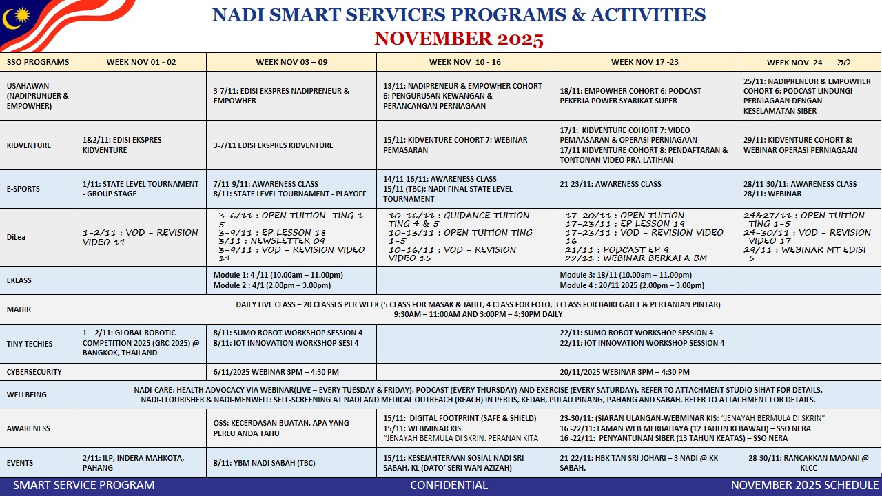 PROGRAM KHAS MERDEKA DAN HARI MALAYSIA @ NADI TARIKH 7 September 2025 (Ahad) LOKASI NADI Felda Tersang 2 TUJUAN – Menyemarakkan semangat patriotisme dan kecintaan terhadap negara dalam kalangan masyarakat setempat. – Menghargai sejarah pembentukan Malaysia pada 16 September 1963 serta mengekalkan […]